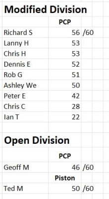 I hedged a bit for the expected wind, so the course was set up a bit shorter than usual. Even though we were in the forest, there was a fair bit of movement especially for the lower powered guns. The wind did not seem to bother some people though; Richard only left 4 targets standing in the Modified Division, and Chris H and Lanny both only left 7. Also, in Modified, Ashley showed that he is really getting along with his new scope as he zoomed up the leader board and came in just one shot behind the guy that brought him into FT last year.
