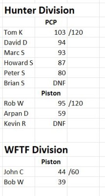 In Hunter Division, Tom was in his usual spot at the top of the list and still made 103/120 in spite of the wind. Also in Hunter, in his first match at Port Colborne (and his second match ever!!), David D posted an awesome 94. Newbie Peter S also had a solid day in his debut at Port with an 80. Arpan was also in his first match at Port, and he pushed his sub-500 springer through the wind to post a solid score.