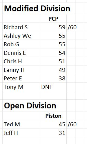 In terms of results, Richard improved on last month and only left 1 target standing in the Modified Division. Ashley We and Rob G tied for 2nd spot with 55/60.