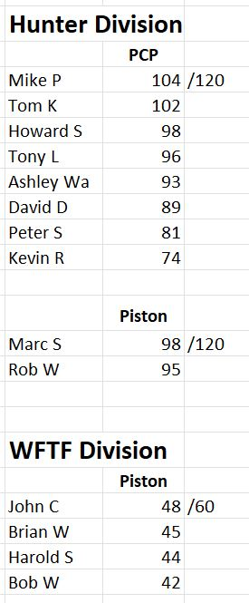 In Hunter Division, Mike P made his Port Colborne debut for the season and recaptured his spot at the top of the list, Tom was just 2 points behind. Kevin is loving the new gun and the switch to the PCP team (thanks to Dave for getting him set up (and not letting him near the new gun with those rusty wrenches!)).